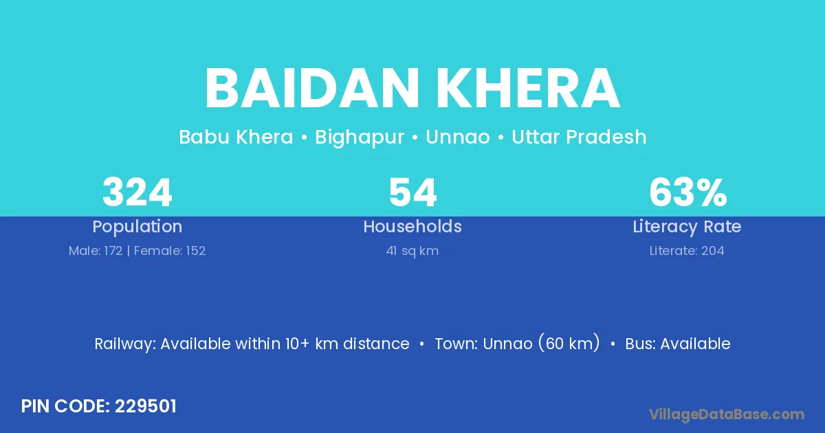 Unnao (60 km) is the nearest town to Baidan Khera village for major economic activities and is located approximately 60 km away.