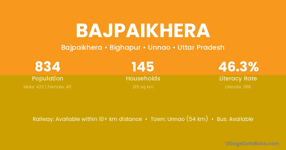 Bajpaikhera village has a total population of 834 people, of which 423 are males and 411 are females.