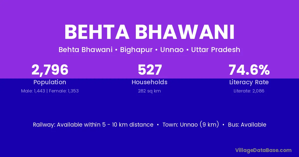 Unnao (9 km) is the nearest town to Behta Bhawani village for major economic activities and is located approximately 9 km away.
