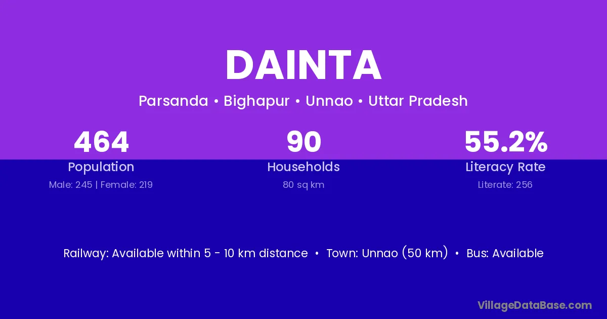 Unnao (50 km) is the nearest town to Dainta village for major economic activities and is located approximately 50 km away.
