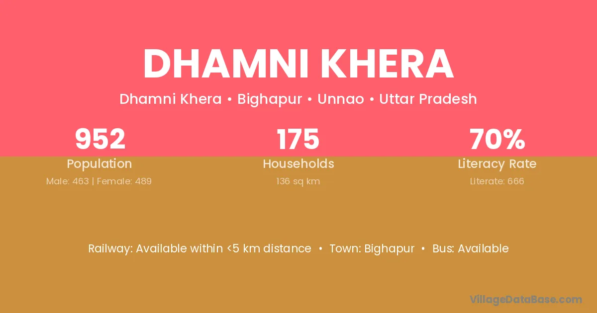 Dhamni Khera village has a total population of 952 people, of which 463 are males and 489 are females.