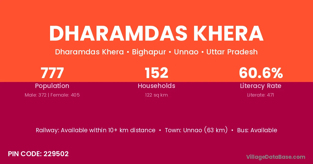 Unnao (63 km) is the nearest town to Dharamdas Khera village for major economic activities and is located approximately 63 km away.