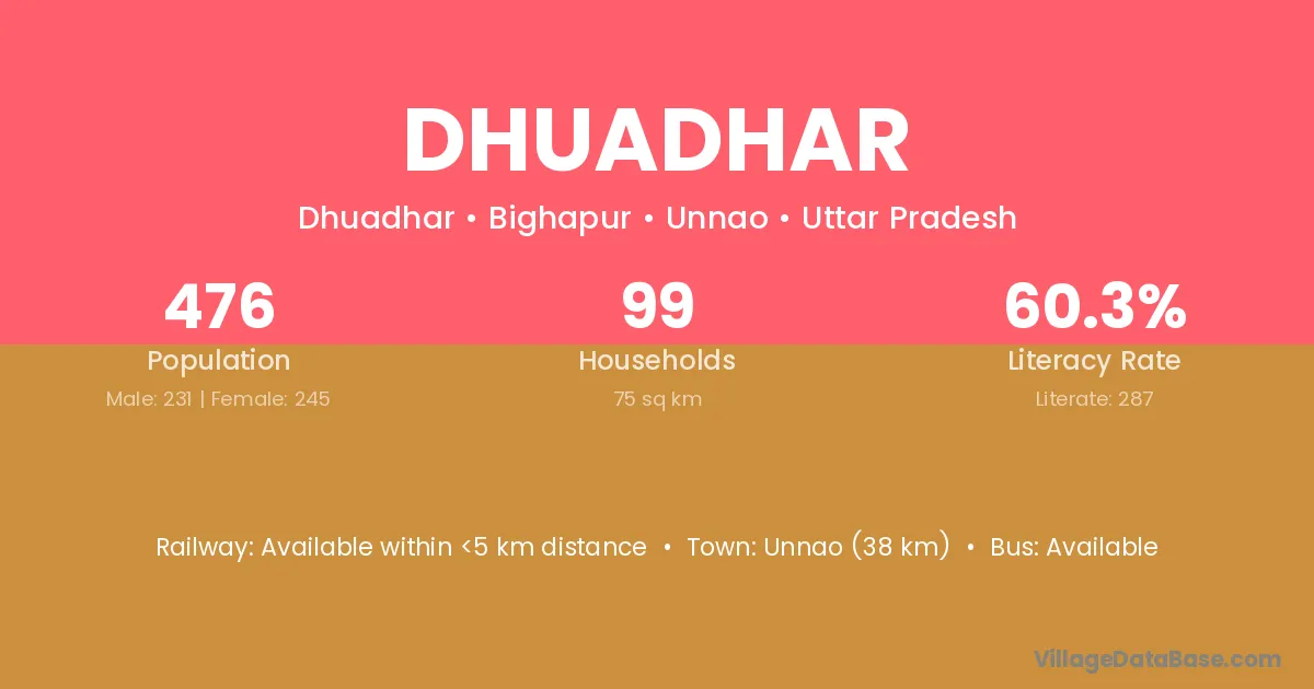 Unnao (38 km) is the nearest town to Dhuadhar village for major economic activities and is located approximately 38 km away.