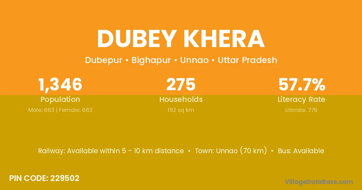 Unnao (70 km) is the nearest town to Dubey Khera village for major economic activities and is located approximately 70 km away.