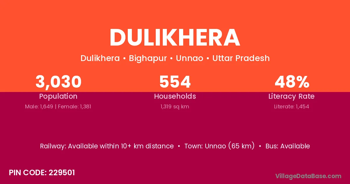 Unnao (65 km) is the nearest town to Dulikhera village for major economic activities and is located approximately 65 km away.