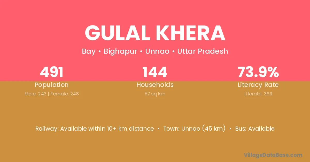 Gulal Khera village has a total population of 491 people, of which 243 are males and 248 are females.