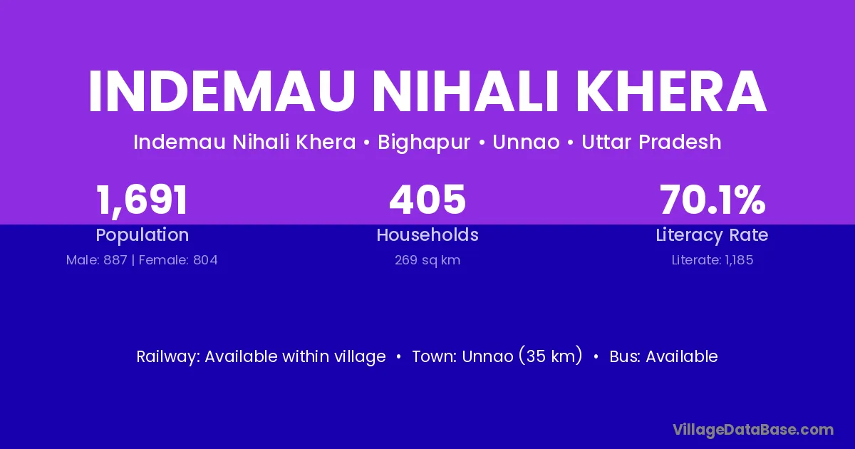 Indemau Nihali Khera village has a total population of 1,691 people, of which 887 are males and 804 are females.