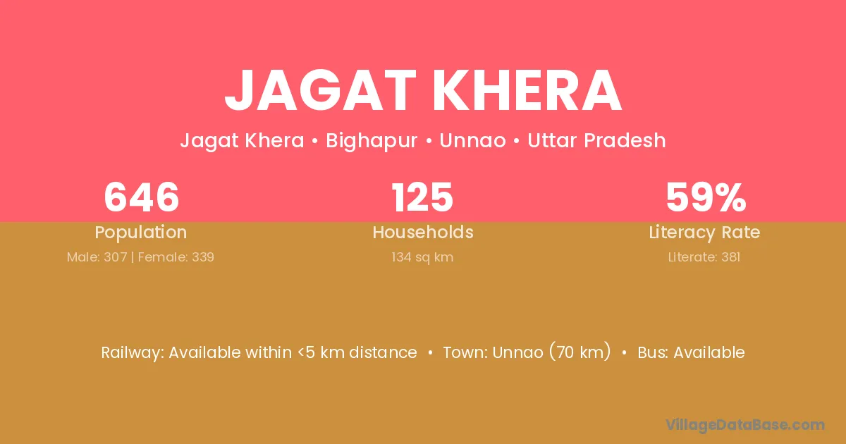 Jagat Khera village has a total population of 646 people, of which 307 are males and 339 are females.