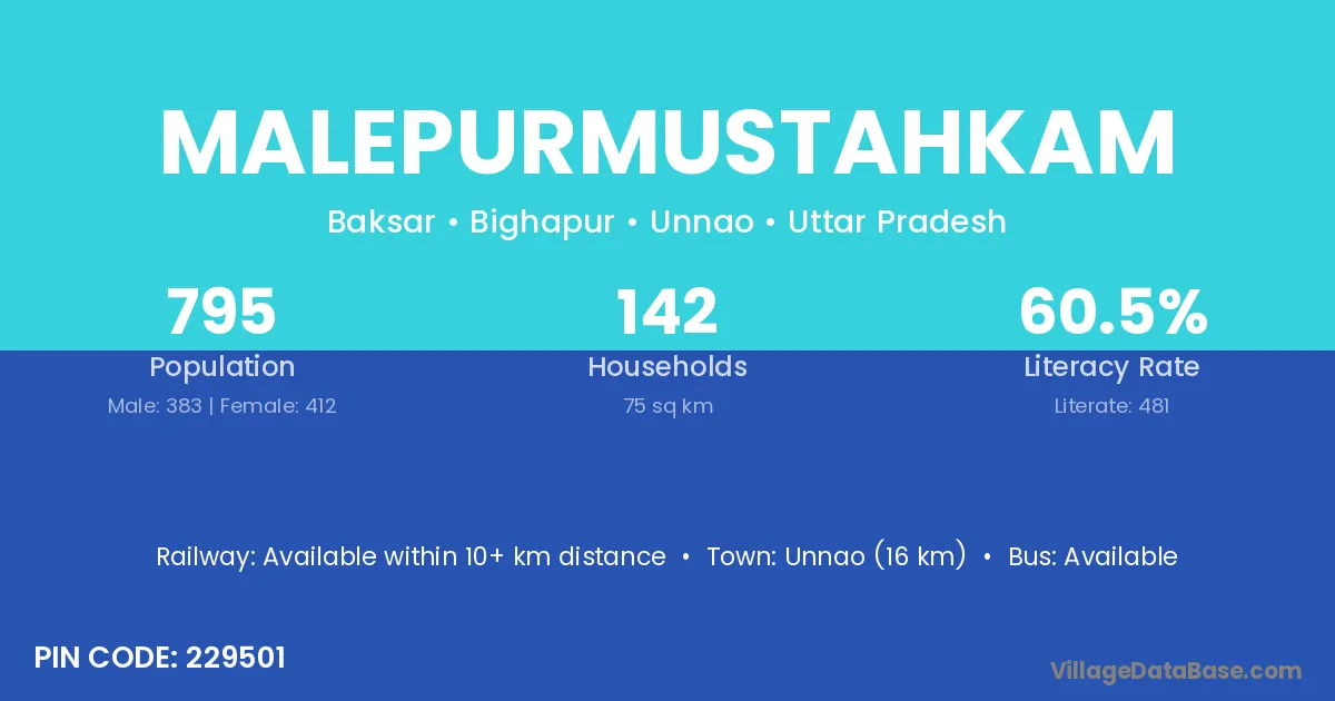 Unnao (16 km) is the nearest town to Malepurmustahkam village for major economic activities and is located approximately 16 km away.
