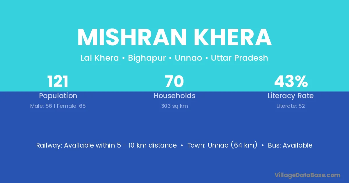 Unnao (64 km) is the nearest town to Mishran Khera village for major economic activities and is located approximately 64 km away.