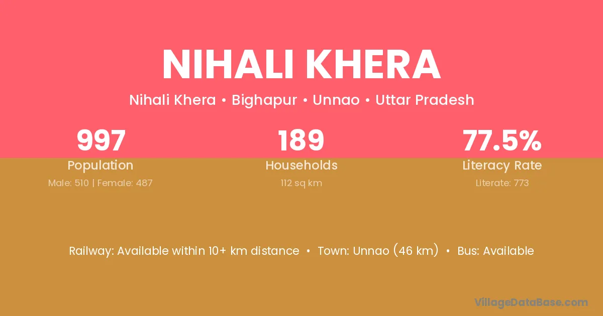 Nihali Khera village has a total population of 997 people, of which 510 are males and 487 are females.