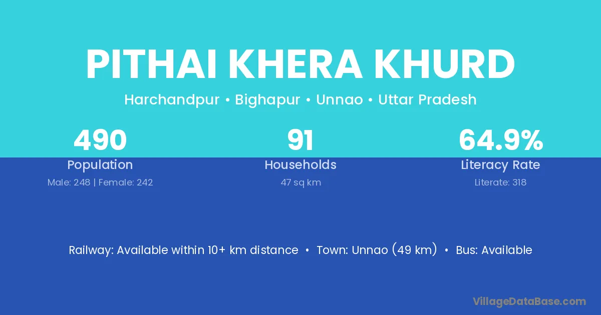 Pithai Khera Khurd village has a total population of 490 people, of which 248 are males and 242 are females.