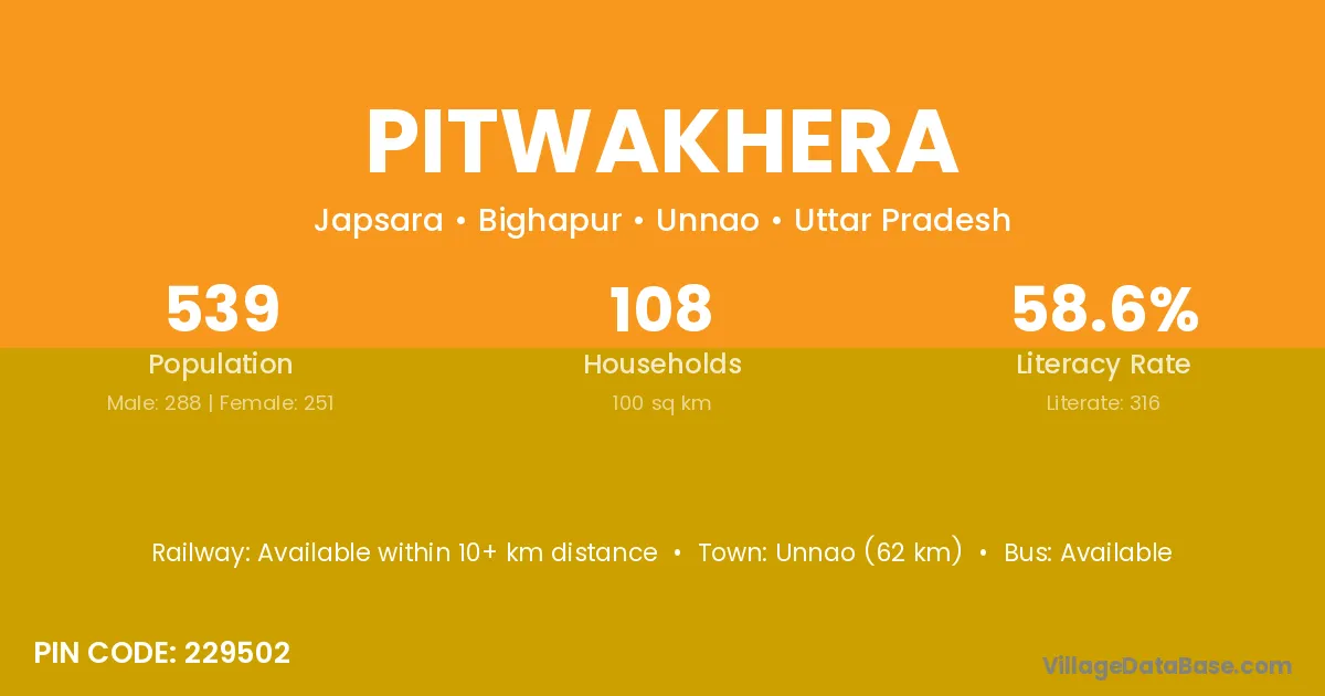 Unnao (62 km) is the nearest town to Pitwakhera village for major economic activities and is located approximately 62 km away.
