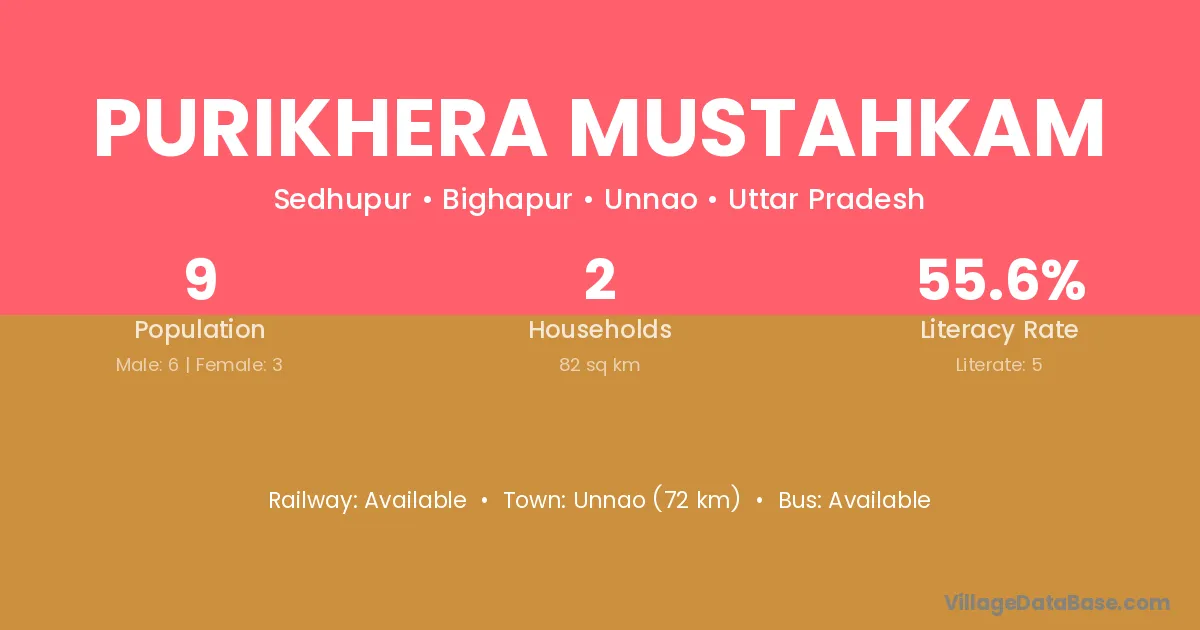 Purikhera Mustahkam village has a total population of 9 people, of which 6 are males and 3 are females.