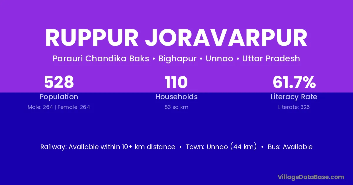 Ruppur Joravarpur village has a total population of 528 people, of which 264 are males and 264 are females.