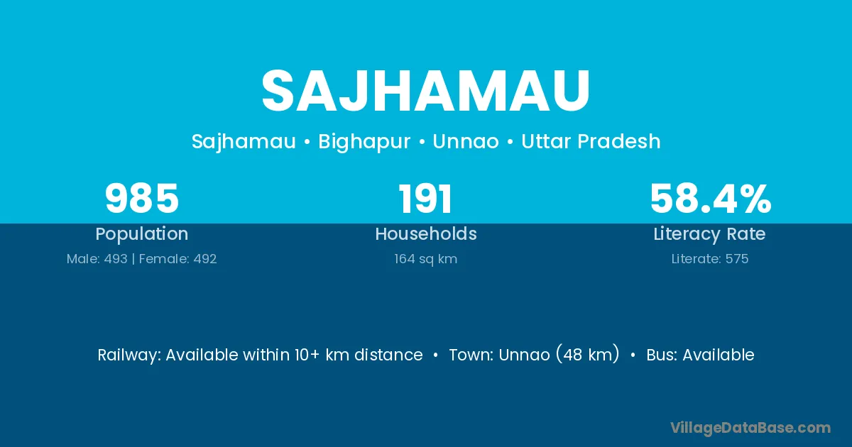 Sajhamau village has a total population of 985 people, of which 493 are males and 492 are females.
