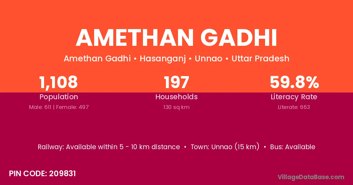 Unnao (15 km) is the nearest town to Amethan Gadhi village for major economic activities and is located approximately 15 km away.