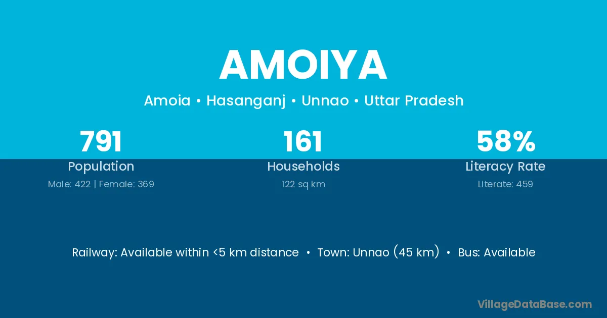 Unnao (45 km) is the nearest town to Amoiya village for major economic activities and is located approximately 45 km away.
