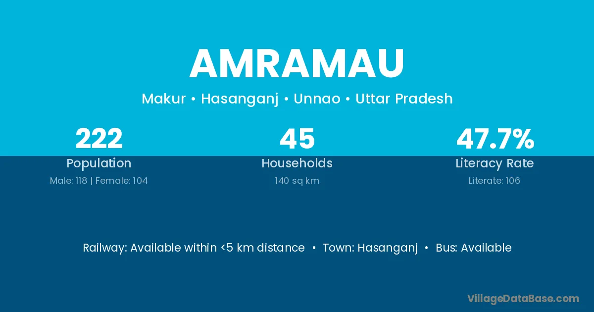 Amramau village has a total population of 222 people, of which 118 are males and 104 are females.