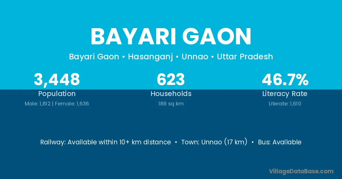 Unnao (17 km) is the nearest town to Bayari Gaon village for major economic activities and is located approximately 17 km away.