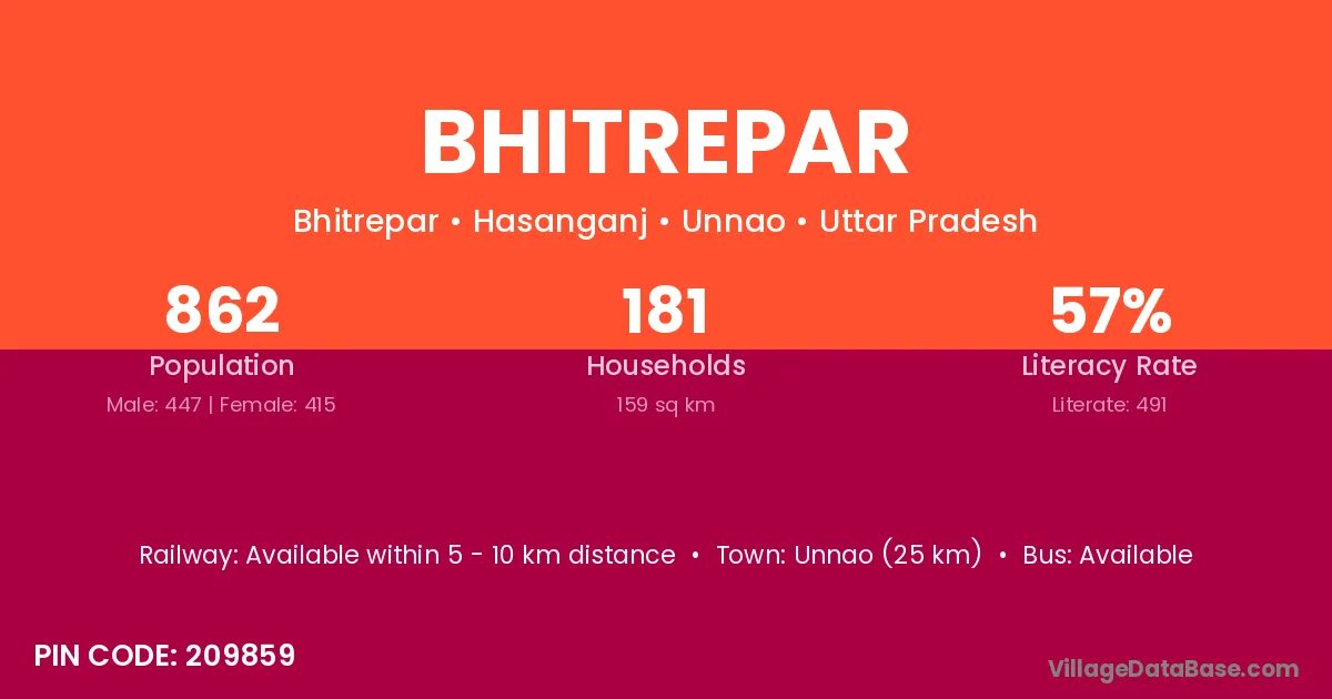 Unnao (25 km) is the nearest town to Bhitrepar village for major economic activities and is located approximately 25 km away.