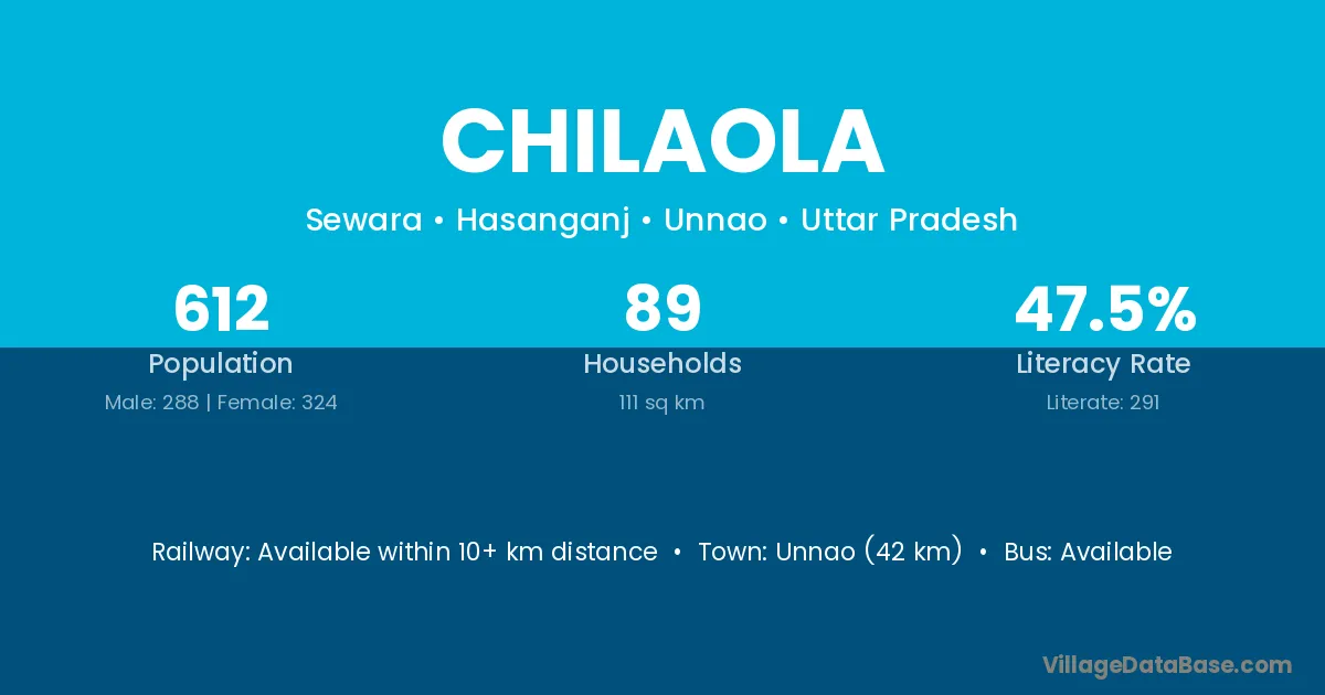 Unnao (42 km) is the nearest town to Chilaola village for major economic activities and is located approximately 42 km away.