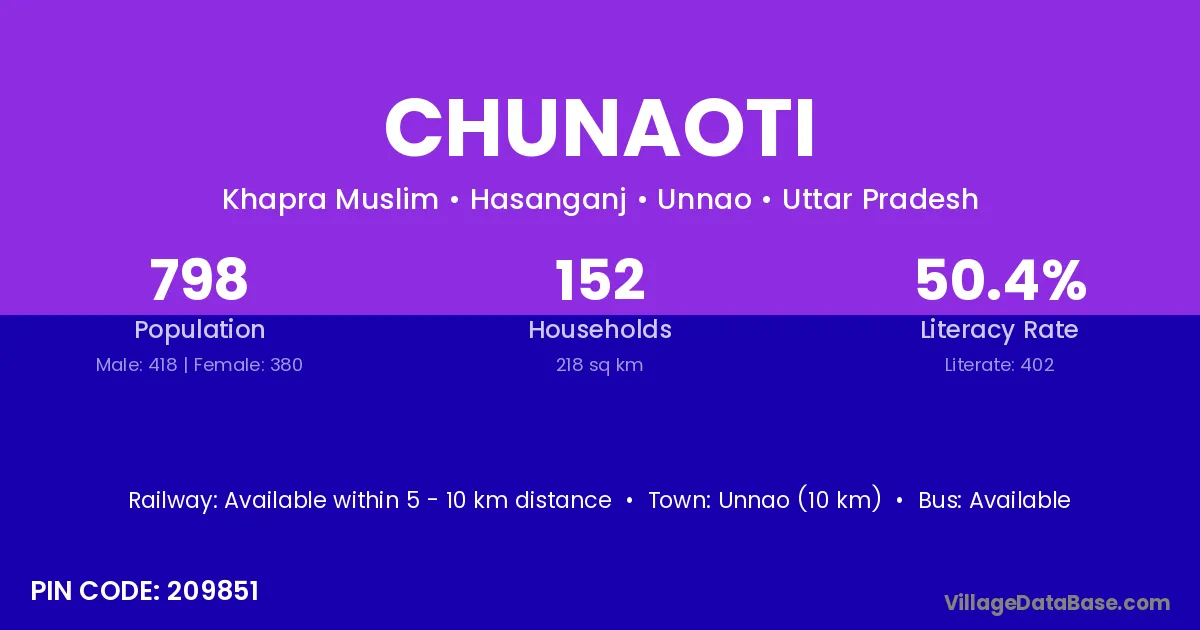 Unnao (10 km) is the nearest town to Chunaoti village for major economic activities and is located approximately 10 km away.