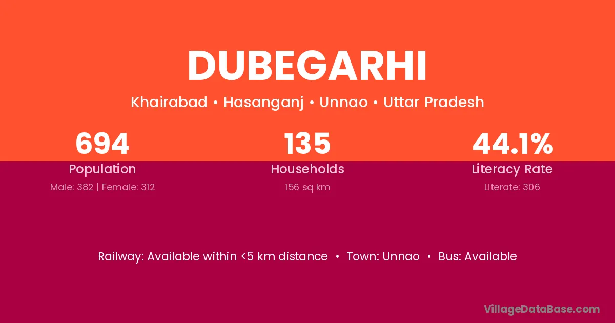 Dubegarhi village has a total population of 694 people, of which 382 are males and 312 are females.