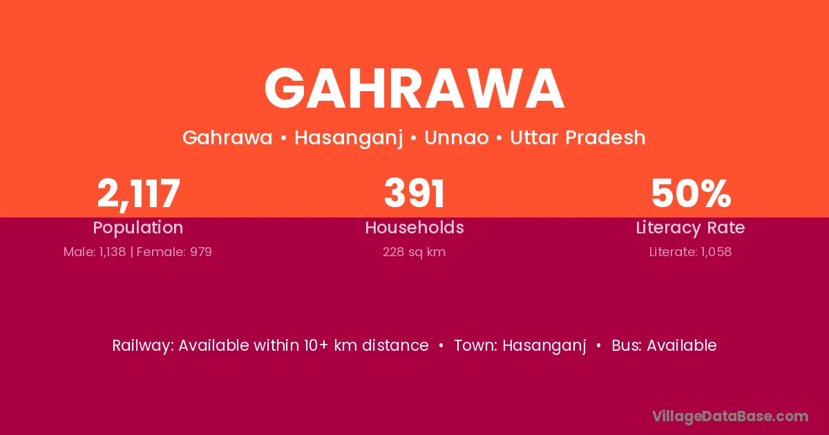 Gahrawa village has a total population of 2,117 people, of which 1,138 are males and 979 are females.