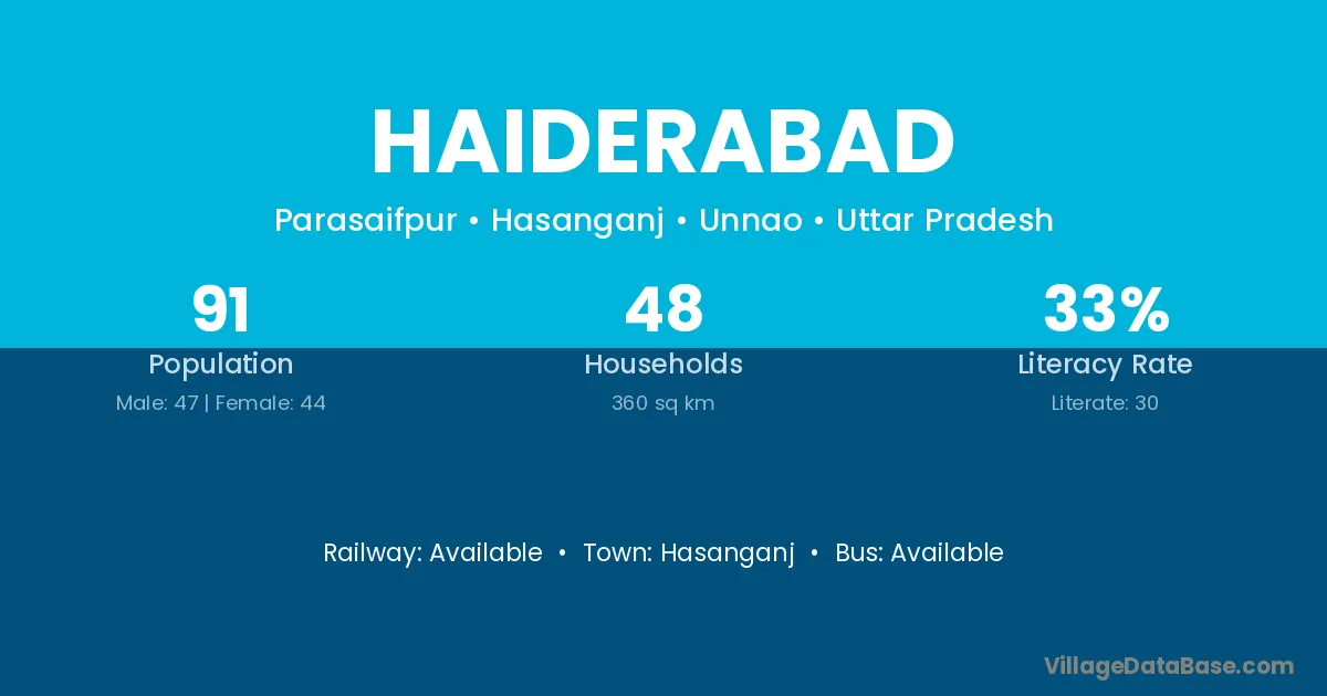 Haiderabad village has a total population of 91 people, of which 47 are males and 44 are females.
