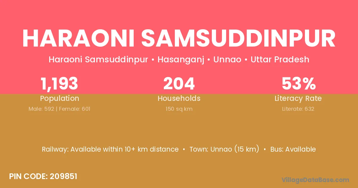 Unnao (15 km) is the nearest town to Haraoni Samsuddinpur village for major economic activities and is located approximately 15 km away.