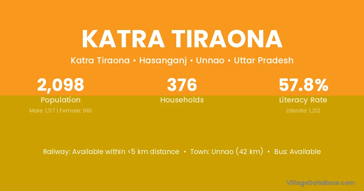 Unnao (42 km) is the nearest town to Katra Tiraona village for major economic activities and is located approximately 42 km away.
