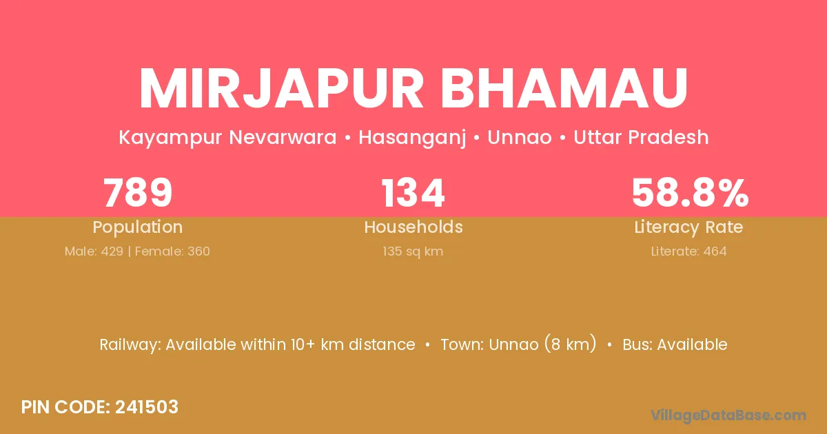 Unnao (8 km) is the nearest town to Mirjapur Bhamau village for major economic activities and is located approximately 8 km away.