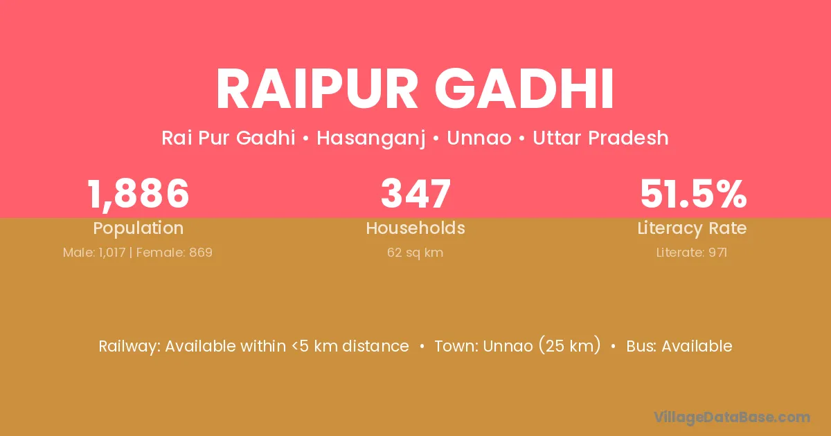 Unnao (25 km) is the nearest town to Raipur Gadhi village for major economic activities and is located approximately 25 km away.