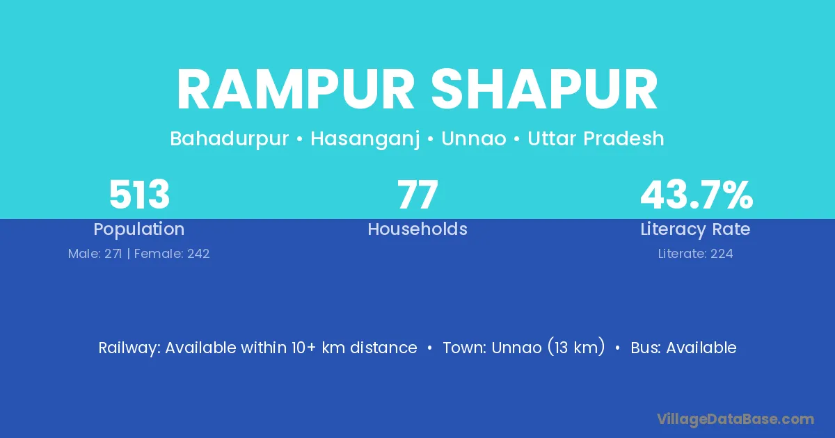 Unnao (13 km) is the nearest town to Rampur Shapur village for major economic activities and is located approximately 13 km away.