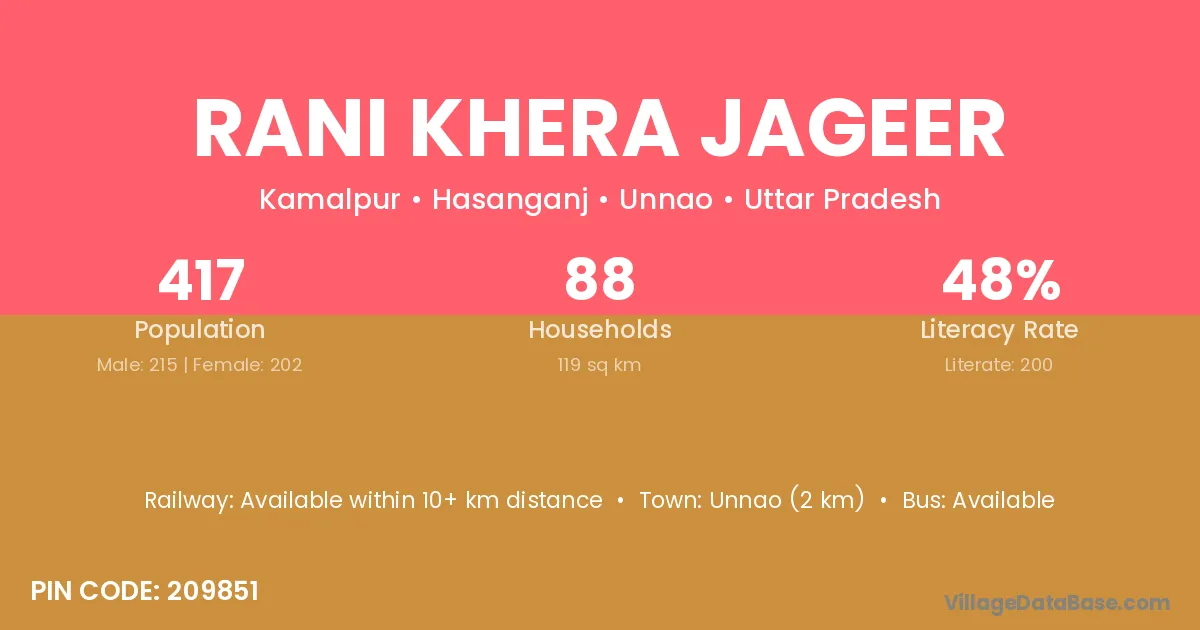 Unnao (2 km) is the nearest town to Rani Khera Jageer village for major economic activities and is located approximately 2 km away.
