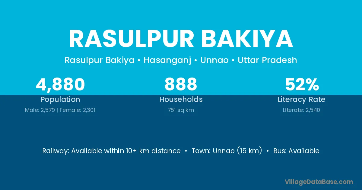 Rasulpur Bakiya village has a total population of 4,880 people, of which 2,579 are males and 2,301 are females.