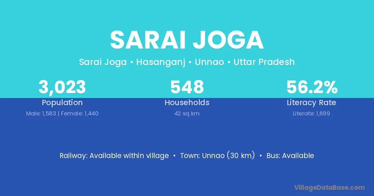 Unnao (30 km) is the nearest town to Sarai Joga village for major economic activities and is located approximately 30 km away.