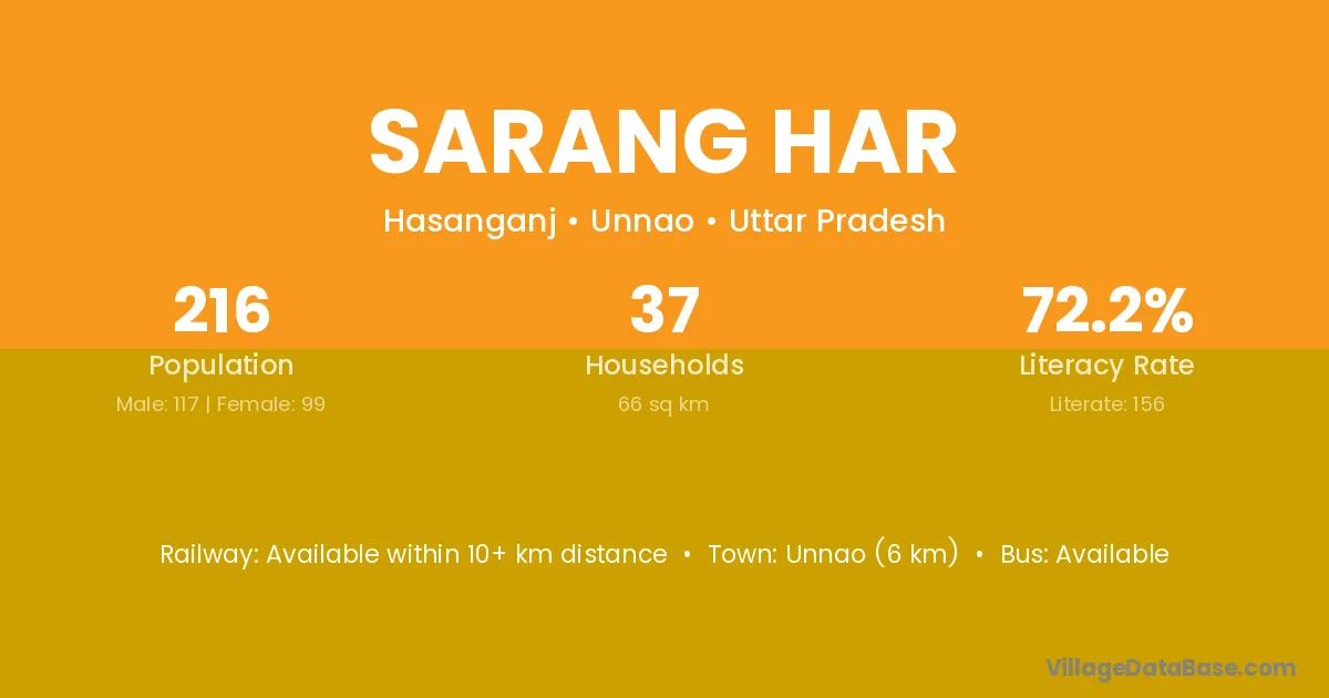 Unnao (6 km) is the nearest town to Sarang Har village for major economic activities and is located approximately 6 km away.