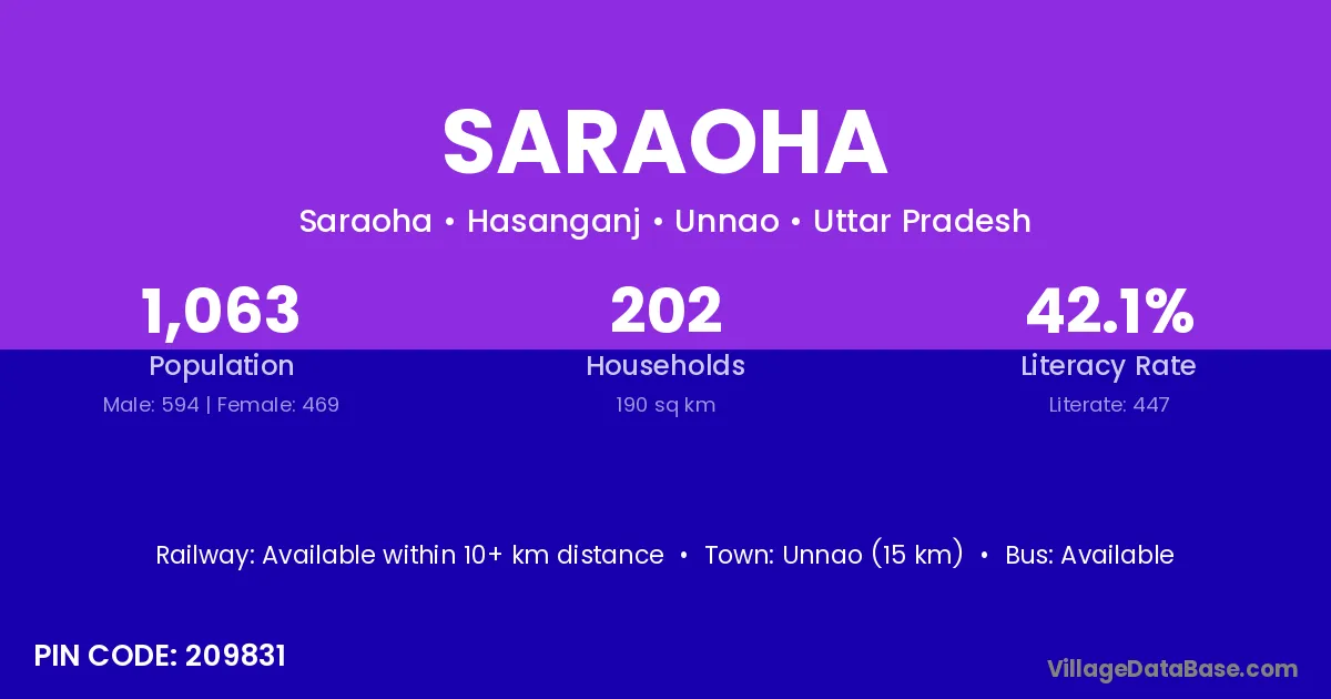 Unnao (15 km) is the nearest town to Saraoha village for major economic activities and is located approximately 15 km away.