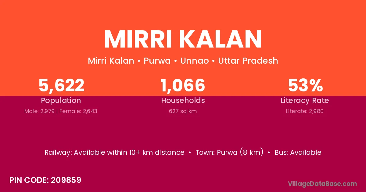 Purwa (8 km) is the nearest town to Mirri Kalan village for major economic activities and is located approximately 8 km away.