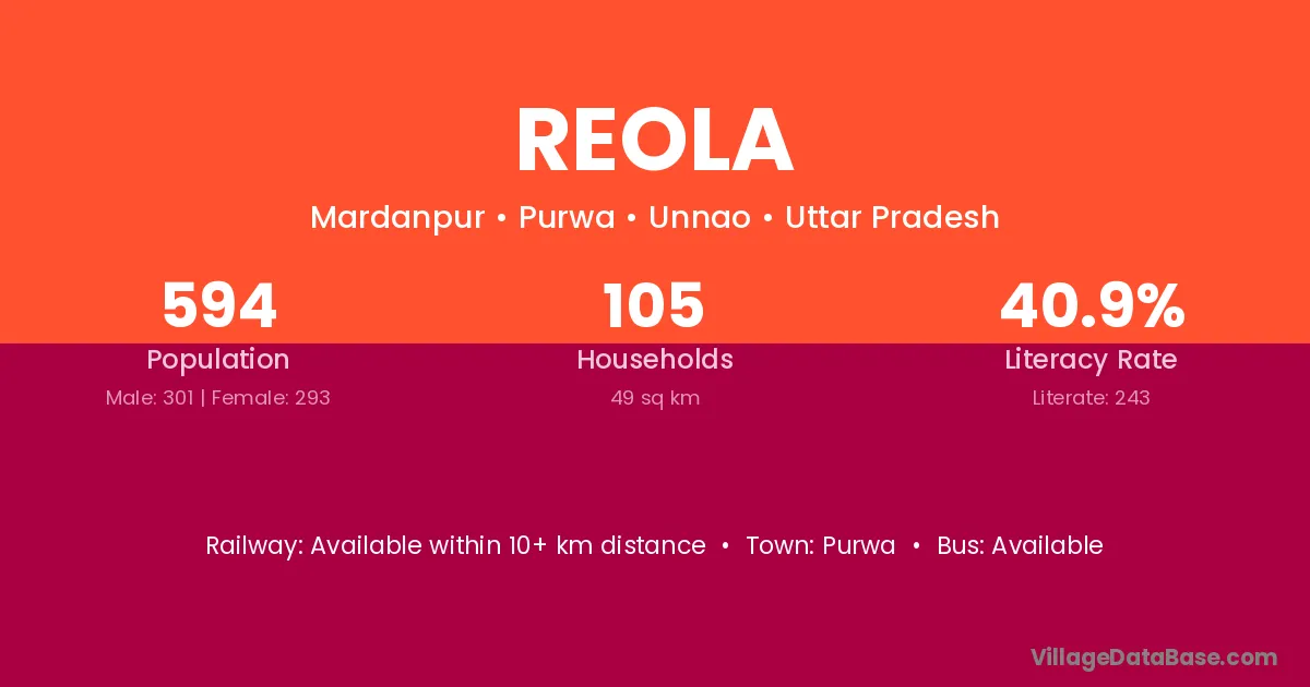 Reola village has a total population of 594 people, of which 301 are males and 293 are females.