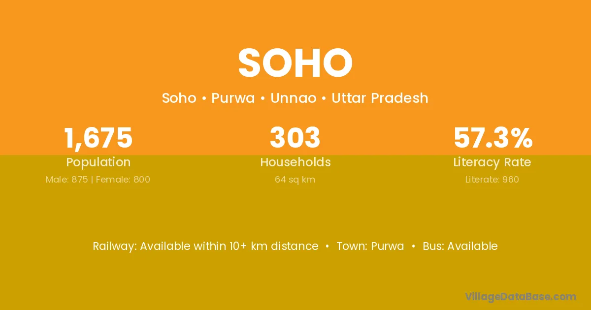 Soho village has a total population of 1,675 people, of which 875 are males and 800 are females.