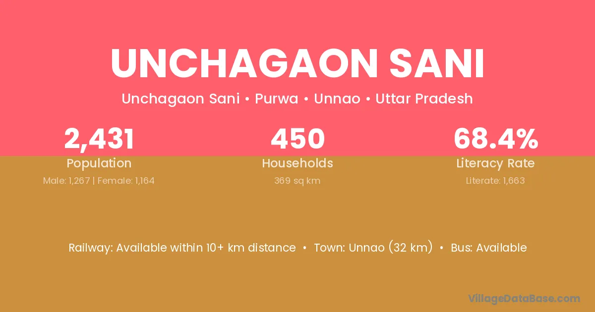 Unnao (32 km) is the nearest town to Unchagaon Sani village for major economic activities and is located approximately 32 km away.