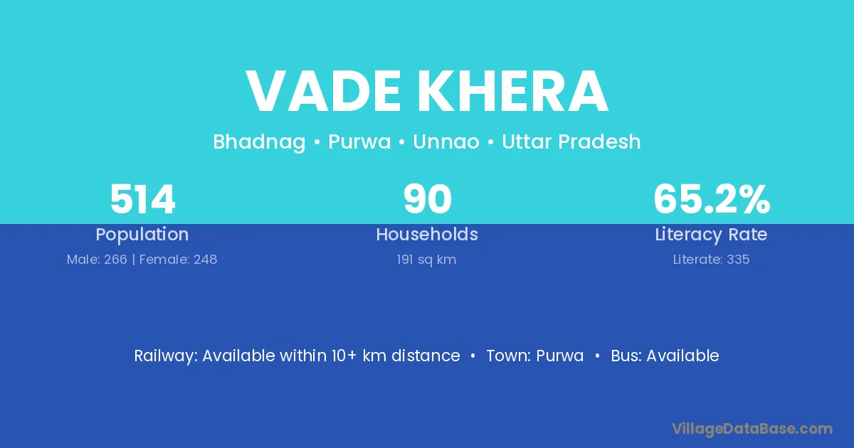 Vade Khera village has a total population of 514 people, of which 266 are males and 248 are females.