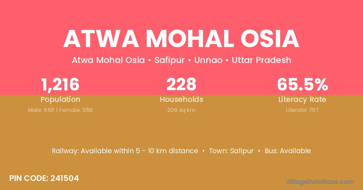 Atwa Mohal Osia village has a total population of 1,216 people, of which 658 are males and 558 are females.