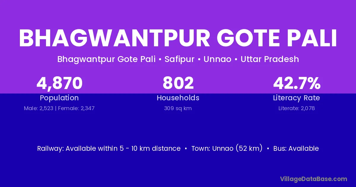 Unnao (52 km) is the nearest town to Bhagwantpur Gote Pali village for major economic activities and is located approximately 52 km away.