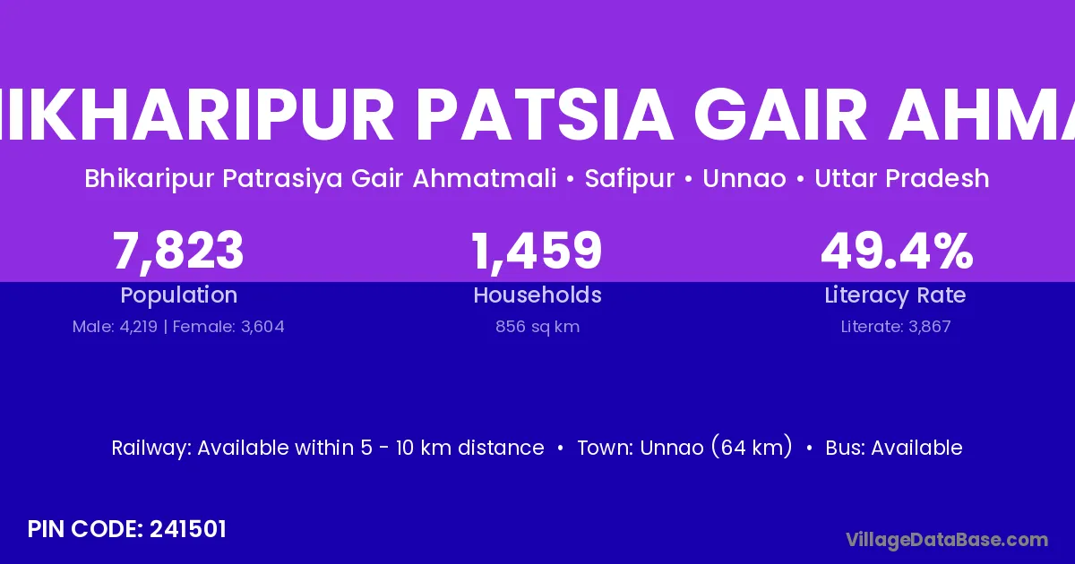 Bhikharipur Patsia Gair Ahmali village has a total population of 7,823 people, of which 4,219 are males and 3,604 are females.