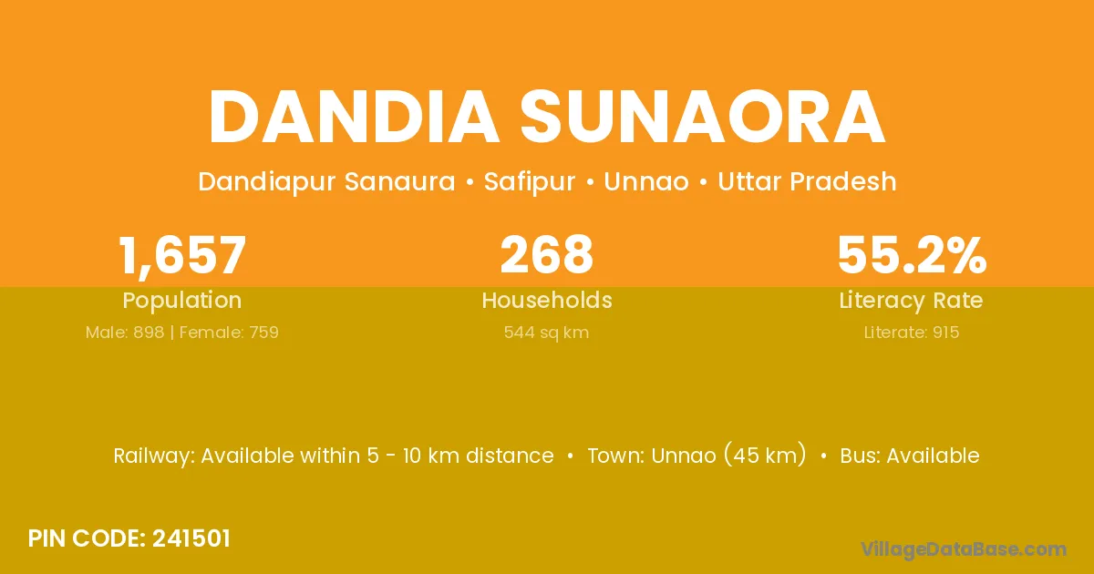 Unnao (45 km) is the nearest town to Dandia Sunaora village for major economic activities and is located approximately 45 km away.