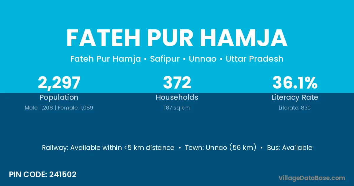 Unnao (56 km) is the nearest town to Fateh Pur Hamja village for major economic activities and is located approximately 56 km away.